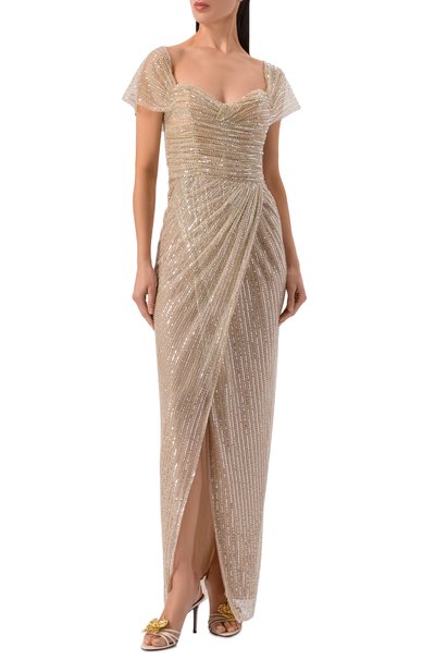 Драпированное миди-платье с открытым плечом и ассиметричным подолом сшито из эластичн ого купро. Модель, застегивающаяся сбоку потайной молнией, дополнена боди из мягкого хлопка джерси.