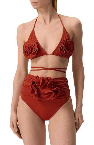 Плавки с завышенной посадкой выполнили из нейлона с добавлением эластана. Модель украсили драпировкой и крупной съемной брошью в виде цветка в тон.