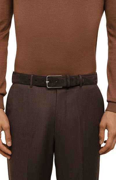 Ремень из замши с градиентным окрашиванием застегивается контрастной прямоугольной пряжкой. Рядом с ней вытиснили логотип марки. Аксессуар стандартной ширины дополнили неподвижной шлевкой.