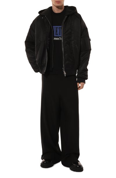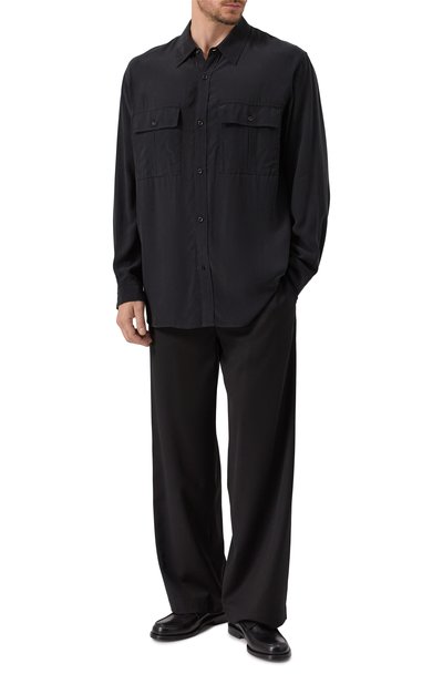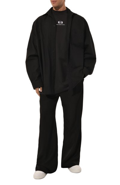 Широкие брюки высокой посадки сшиты из гладкого полиэстера с добавлением хлопка. Модель с защипами и стрелками дополнена четырьмя врезными карманами. Под эластичным поясом расположены четыре фирменных стежка.