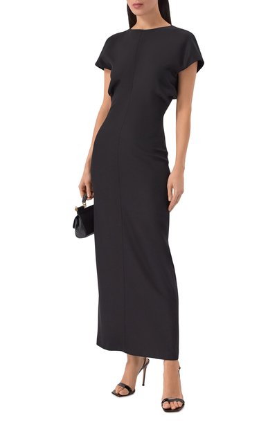 Платье в пол сшили из вискозы, плотно покрытой прозрачными стразами. Из такого же материала выполнили капюшон, задрапированный спереди. В левом боковом шве скрыли молнию.