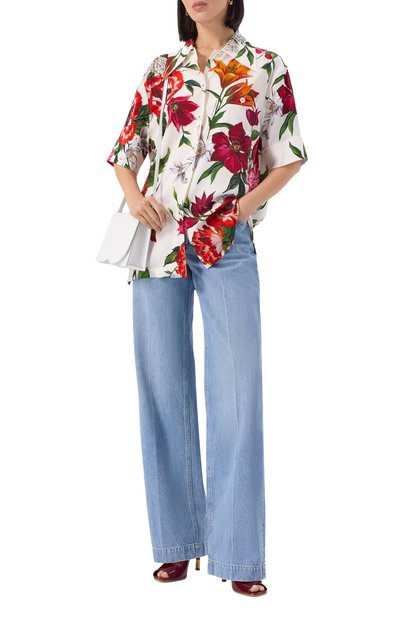 В коллекцию Warm Weather вошла блуза из хлопкового поплина с ярким цветочным принтом. Модель с английск им воротником, отворотами на рукавах и защипами сзади завязывается на узел внизу.