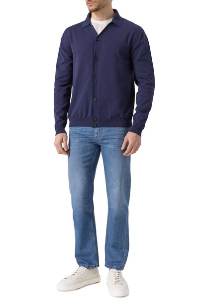 Для изготовления кардигана с воротником-стойкой и боковыми карманами использовали стрейчевый трикотаж на основе хлопка, усиленный шелком. Переднюю часть модели на встречной молнии выполнили из тонкой замши.