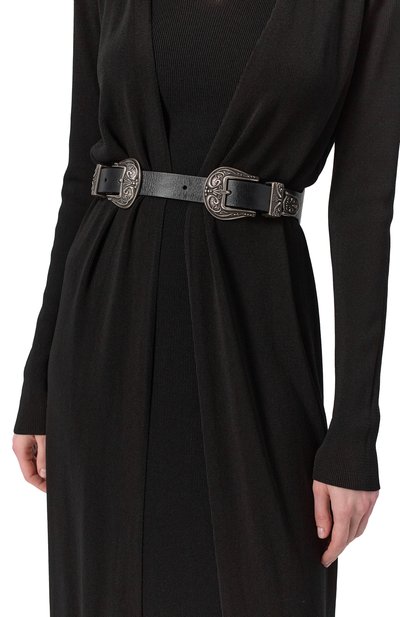 Ремень из гладкой кожи застегивается прямоугольной металлической пряжкой с закругленными углами. Аксессуар дополнили съемным кошельком с треугольным клапаном.