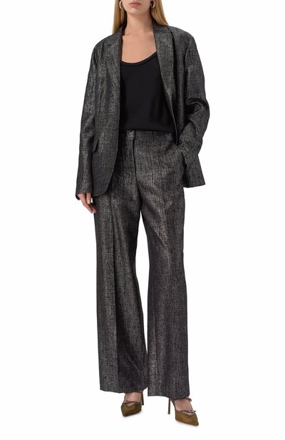 Брюки с большими боковыми карманами и одним задним сшили из микса льна и вискозы. Пояс-кулиску продублировали широкой трикотажной вставкой, создав эффект многослойности. Сзади — фирменная звезда.