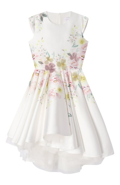 Атласное платье с цветочным мотивом вручную украсили аппликацией из стразов и бусин. Модель с пышным асимметричным подолом и хлопковым подкладом застегивается потайной молнией сзади.