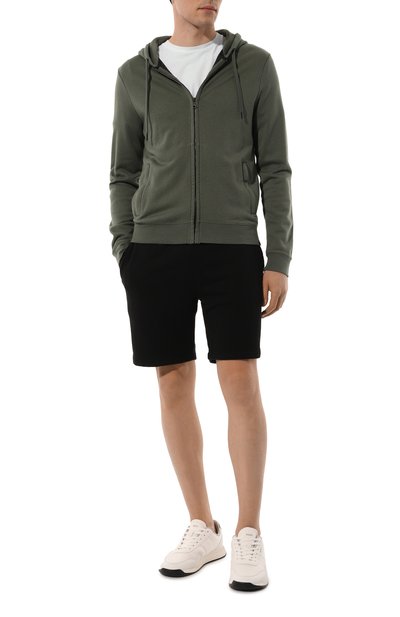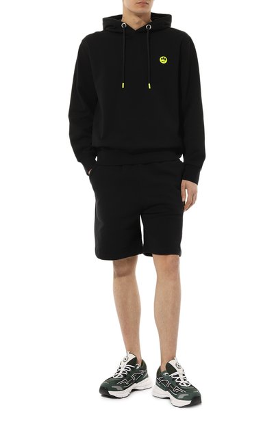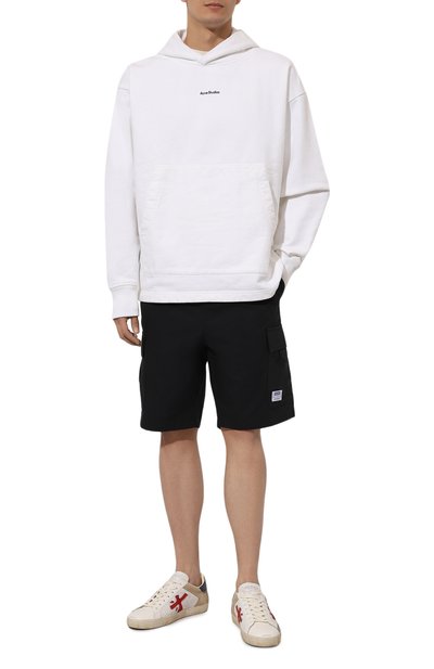 Хлопковые шорты с декоративной ширинкой дополнили эластичным поясом-кулиской. По бокам и сзади предусмотрели прорезные карманы, один из которых украсили контрастным логотипом и изображением медведя.