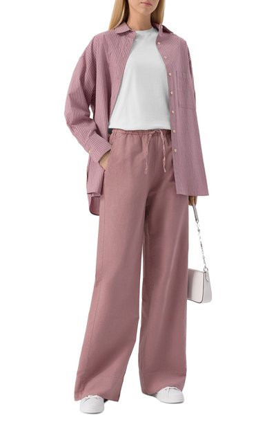 Для пошива свободной рубашки с закругленной линией низа и слегка удлиненной спинкой использовали хлопок в полоску. Левый рукав дополнили накладкой-эмблемой сзади.
