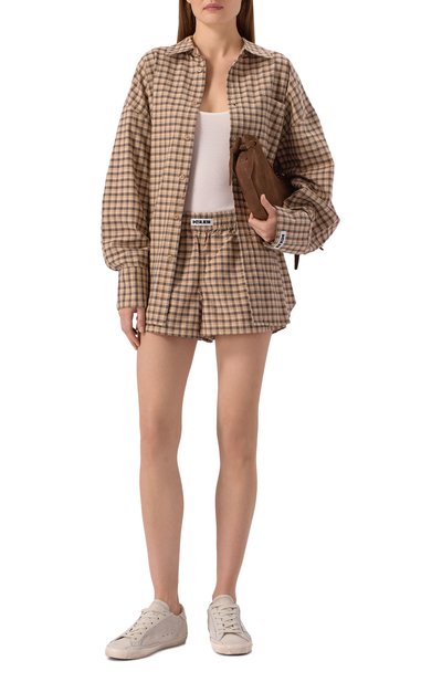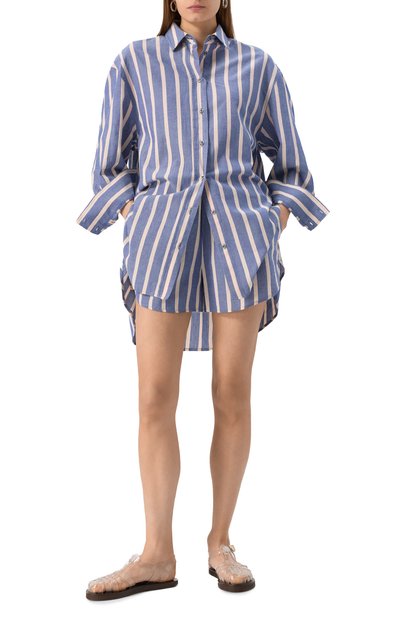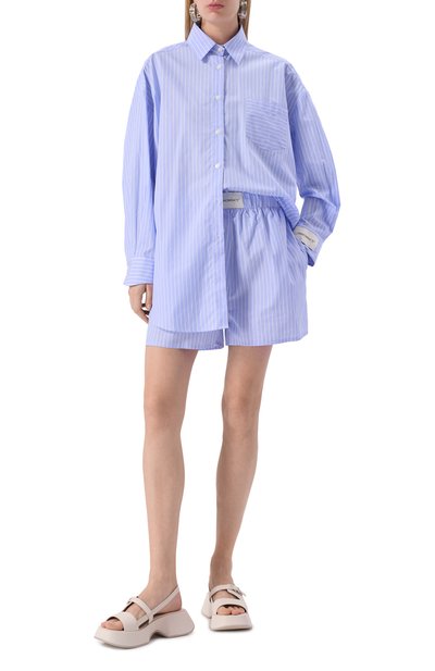 Шорты в полоску выполнили из хлопкового оксфорда и украсили слева накладкой в виде эмблемы марки. Модель с закругленными краями дополнили задним и двумя боковыми карманами.