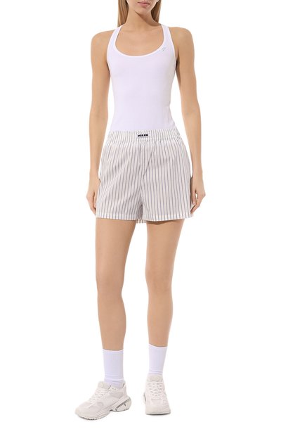 Шорты в полоску выполнили из хлопкового оксфорда и ук расили слева накладкой в виде эмблемы марки. Модель с закругленными краями дополнили задним и двумя боковыми карманами.