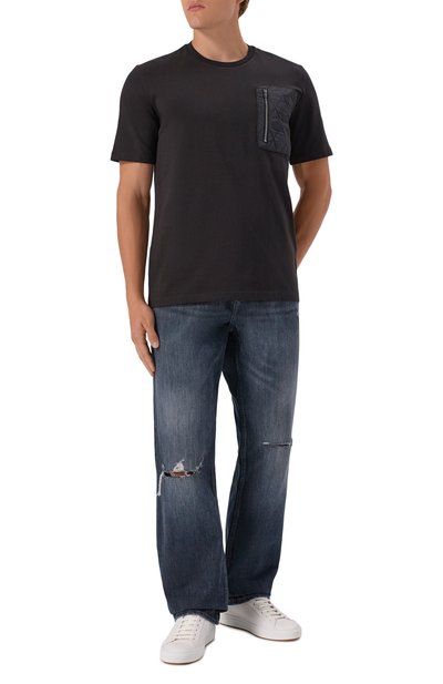 Футболку с рельефными плечевыми швами и вертикальной строчкой на спинке сшили из хлопкового джерси. Модель, словно немного выцветшую со временем, дополнили сбоку ремешком с пуговицей и большим накладным карманом с клапаном спереди.