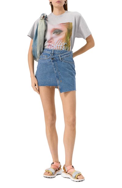 Босоножки с объемным узлом на перемычке выполнили из текстиля в контрастную полоску. Им же обтянули скульптурную танкетку. Модель застегивается узким кожаным ремешком на пряжку сбоку.