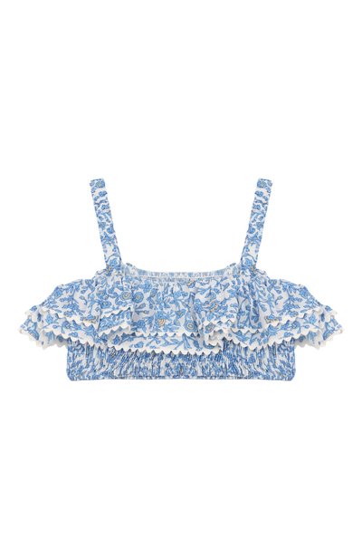 Топ сшили из хлопкового поплина Liberty с принтом Betsy Celeste. Модель с круглой горловиной и двухслойной расклешенной баской застегивается тремя перламутровыми пуговицами сзади.