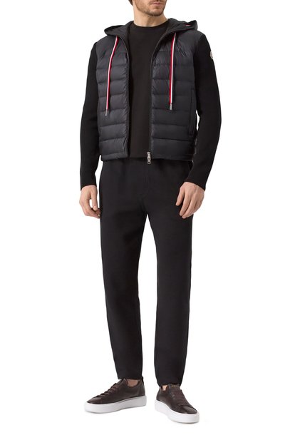 Вязаный хлопковый кардиган с боковыми карманами дополнили стегаными полочками из полиамида. На регулируемом капюшоне из такой же ткани предусмотрели утягивающий шнурок в цветах фирменного триколора, а левый рукав украсили фетровым патчем-эмблемой.