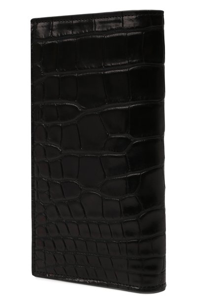 Портмоне со съемной ручкой-петлей выполнили из кожи миссисипского аллигатора так, чтобы получить симметричный рисунок на обеих сторонах. Переднюю панель украсили металлическим логотипом, а молнию дополнили фирменным пуллером. Внутри – отделение для купюр, застегивающееся ремешком на кнопке, девять карточных слотов и карманы для чеков.