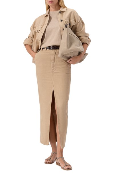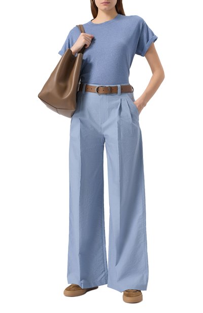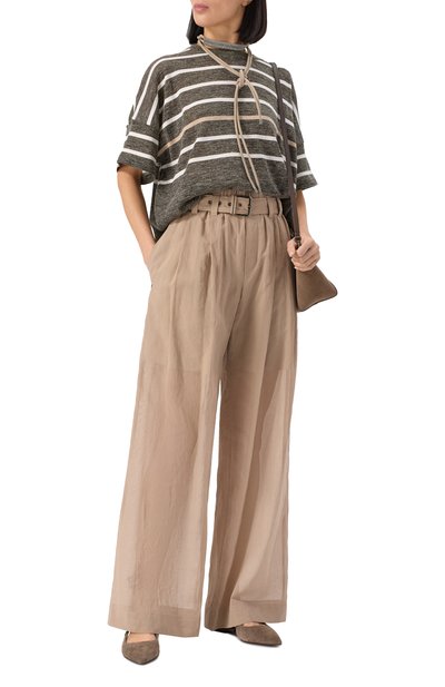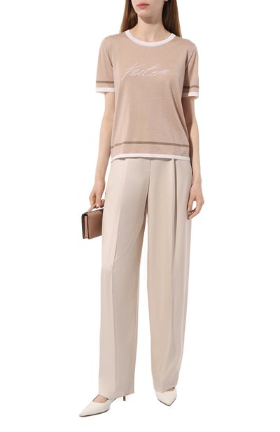 Ажурный пуловер с рифленой отделкой связали из тонкой хлопковой пряжи с добавлением шелка. Спинку декорировали золотистой брендированной пластиной с эмалевым покрытием.