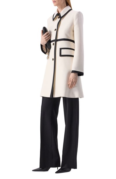 Пальто с гороховым узором и полосами, сформированными бахромой, сшили из шерстяного твида с добавлением нейлона и полиэстера. Для подкладки выбрали вискозу. Модель с контрастным кантом дополнили двумя карманами.