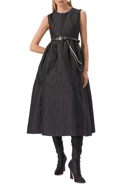 Платье с облегающим лифом и пышным многослойным подолом сшили из кружева шантильи с цветочным мотивом. Модель с разрезом на спинке, украшенном четырьмя бантами из бархата в тон, застегивается потайной молнией сбоку.