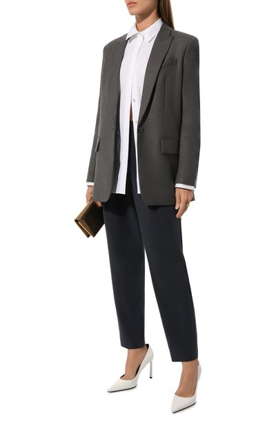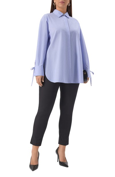 Облегающие брюки с эластичным поясом выполнили из вискозного трикотажа Milano с добавлением полиамида. Сзади модель с вертикальными швами дополнили невысокими разрезами.