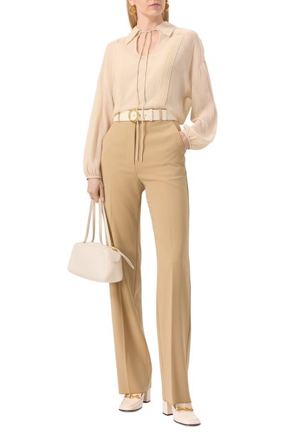 Полупрозрачную блузу Valdai свободного кроя выполнили из тонкого шелкового жоржета. Модель с плиссированными полосами спереди и отло жным воротником дополнили завязками на U-образном вырезе. В комплекте – вискозный нижний топ с узкими бретелями.