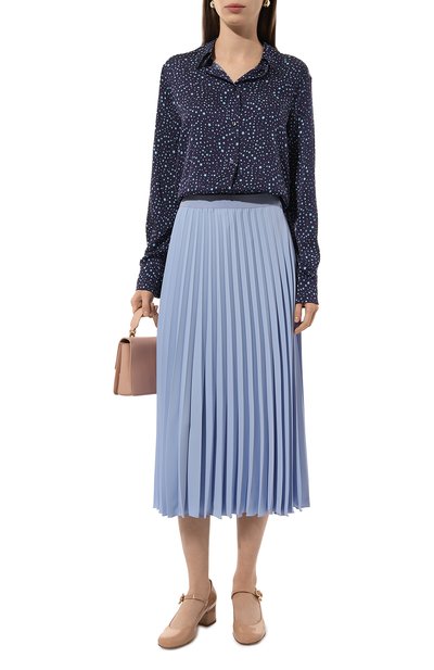 Блузу Valdai с каплевидным вырезом, завязывающимся узкими шнурами, выполнили из полупрозрачного шелкового жоржета. Модель с пышными рукавами и плиссированными складками спереди дополнили съемным топом из вискозы.