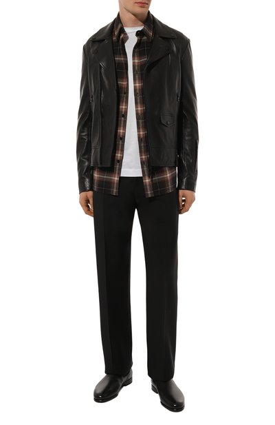 Укорочен ную Ludok, вдохновленную экипировкой мотогонщиков, сшили из гладкой наппы. Модель с кнопками на воротнике-стойке, молниями на рукавах и боковых карманах и смещенной застежкой декорировали рельефными полосатыми вставками и крупным логотипом на спинке.