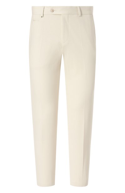 Брюки со стрелками, сшитые из усиленного полиамидом хлопкового трикотажа стрейч, – комфортная альтернатива костюмным моделям. Изделие с фирменным триколором на одной из шлевок дополнили боковыми карманами, а также прорезными задними с пуговицами и монетным.