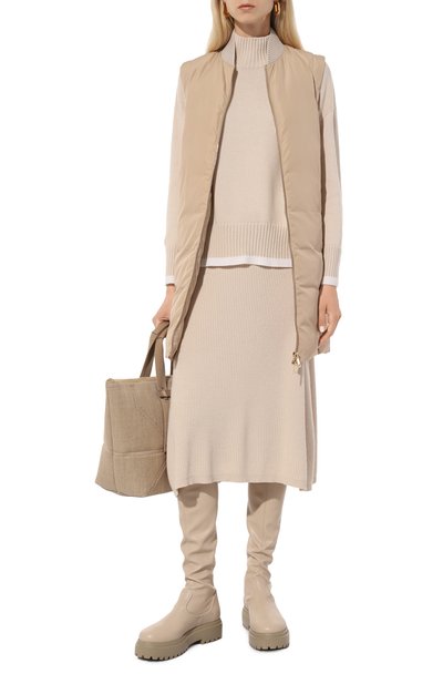 Юбку со шлицей сзади выполнили из рифленого трикотажа на основе мериносовой шерсти с добавлением кашемира. Спереди разместили два декоративных кармана с золотистыми пуговицами.