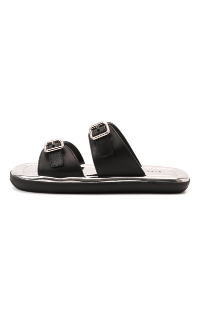 Шлепанцы с формованной стелькой и широкой резиновой подошвой отделали кожей внутри. Атласную союзку изделия украсили пряжкой с кристаллами.