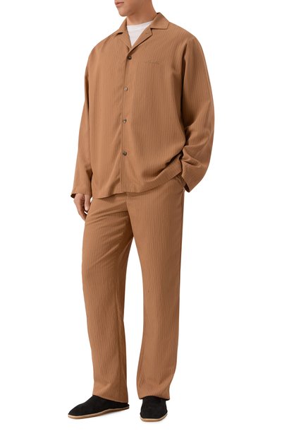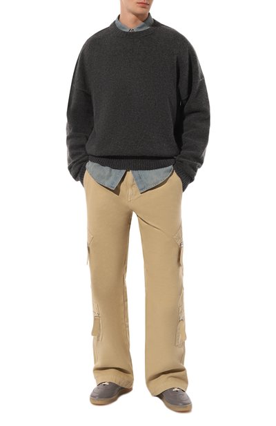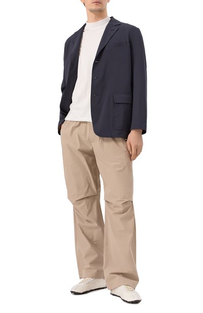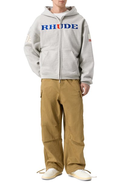 Брюки с регулируемыми кулисками на поясе и низе брючин сшили из хлопка. Выбеленную модель с двумя боковыми, парой задних карманов и одним карго с клапанами украсили вышитой эмблемой.