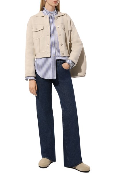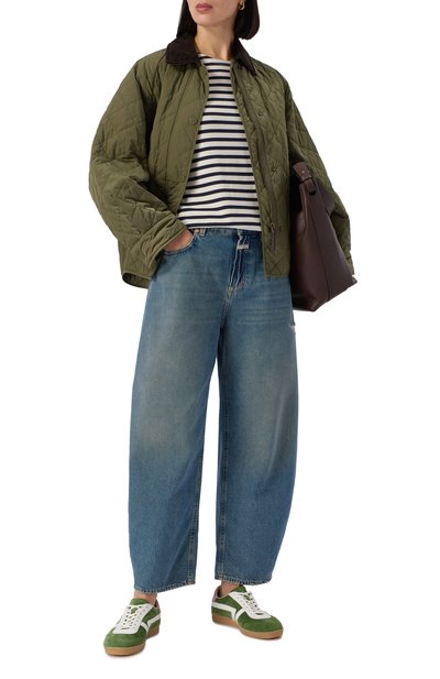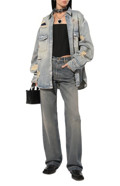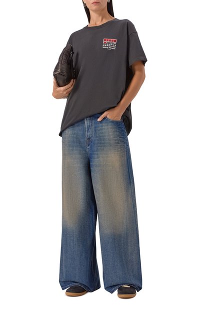 Широкие джинсы с пятью карманами и регулируемой кулиской на поясе сшили из чистого хлопка. Выбеленную модель с искусственными заломами и потертостями украсили сзади нашивкой с числовым кодом и фирменной белой строчкой.