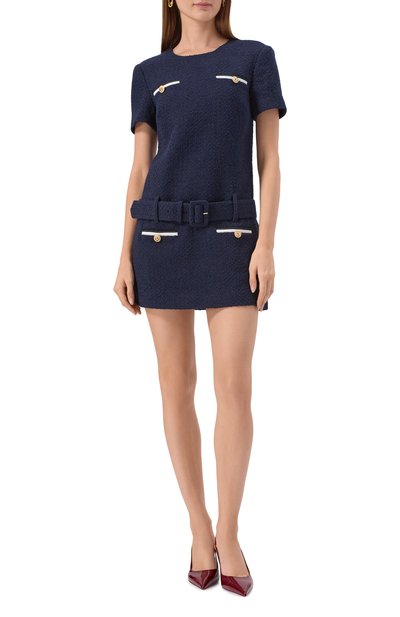 Облегающее мини-платье сшито из трикотажа в муаровую полоску Morphing Pinstripes. Круглый вырез и манжеты коротких рукавов выполнили из однотонной ткани в рубчик.