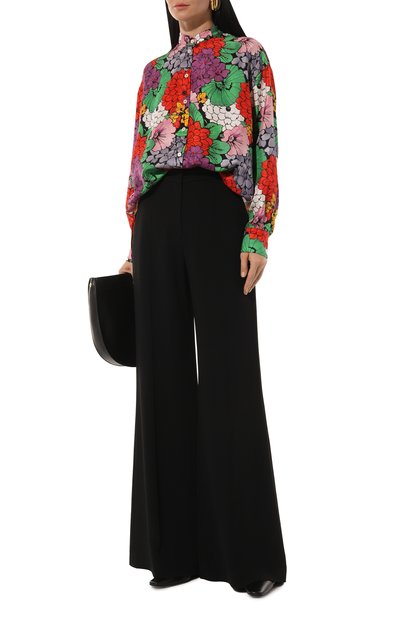 Блузу с укороченными объемными рукавами, узким воротником-стойкой и разрезом с пуговицей спереди сшили из льняной ткани с цветочным принтом. В комплекте – шифоновый платок с таким же ярким мотивом.