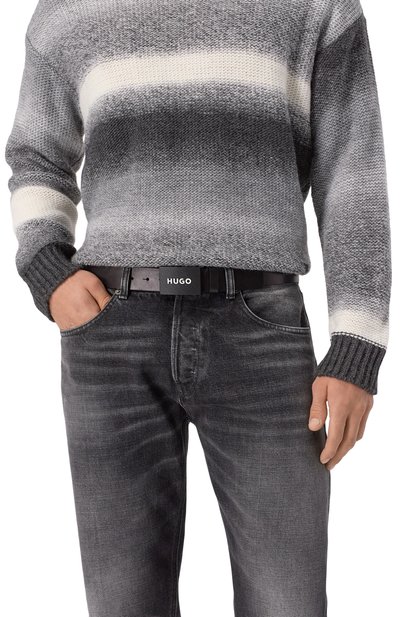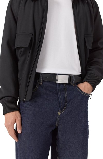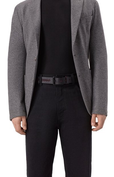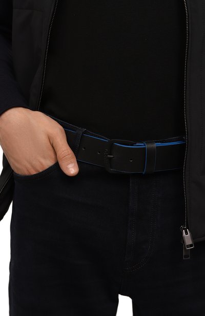 Ремень из гладкой кожи дополнен квадратной пряжкой с матовым финишем в тон. Узкая шлевка украшена логотипом бренда. Аксессуар с фирменными синими стежками удачно дополнит образ с брюками.