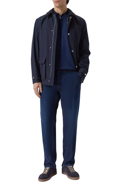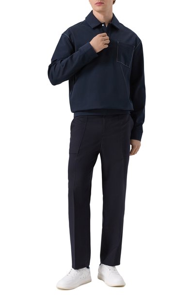 Поло из шерстяного трикотажа вошло в капсульную коллекцию, созданную с Porsche. Спереди модель украсили логотипами компаний, а воротник и манжеты подчеркнули полосами.
