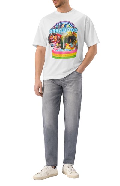 Зауженные джинсы сшили из хлопка с добавлением эластана, полиэстера и модала. Самый маленький из пяти карманов украсили брендированным ярлыком. Сзади на поясе — патч с логотипом.