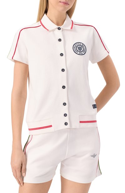 Костюм выполнили из мягкого хлопкового трикотажа с добавлением полиэстера. Кардиган с длинной пуговичной планкой и шорты с двумя врезными карманами украсили контрастными полосками, вышитым логотипом марки и эмблемой ВВС Италии.
