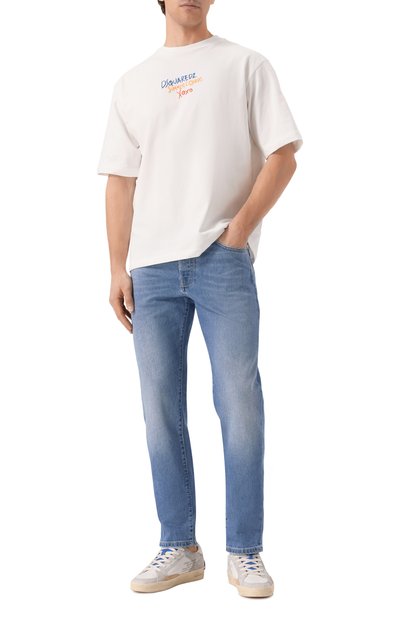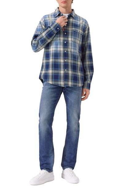 Выбеленные джинсы из жесткого денима дополнили контрастным поясом со шлевками для ремня, выполненным из поплина. Самый маленький из пяти карманов украсили вышитым логотипом марки.