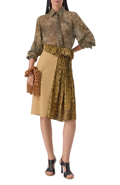 Юбку из хлопкового денима с высокой шлицей дополнили парой прорезных карманов сзади, а также четырьмя накладными спереди. Их клапаны, как и сама модель, застегиваются золотистыми пуговицами с кристаллами. В комплекте — регулируемый текстильный пояс.