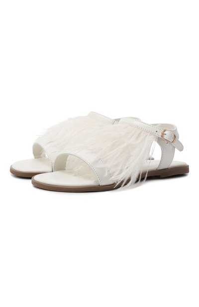 Сандалии Elle выполнили из мягкой телячьей кожи. Модель с гибкой подошвой фиксируется на ноге узким ремешком с золотистой пряжкой и страусиными перьями.
