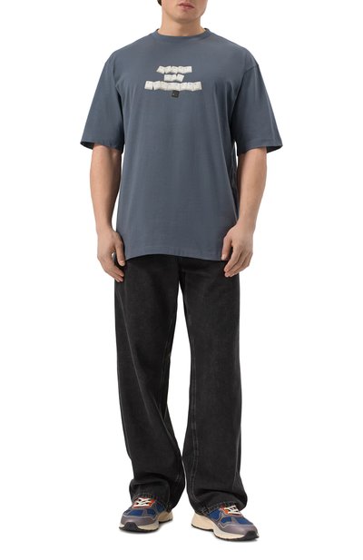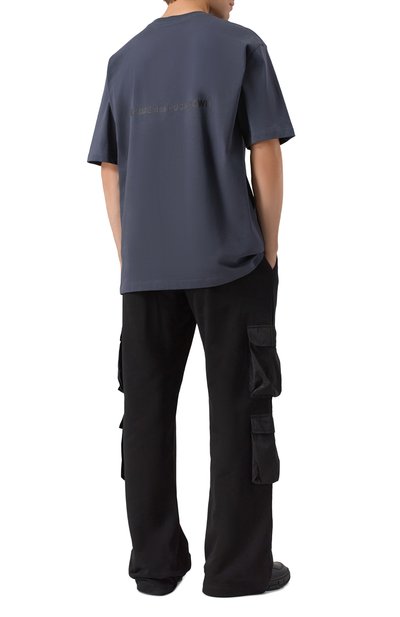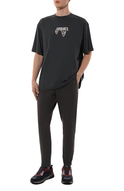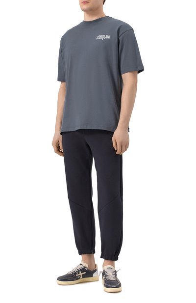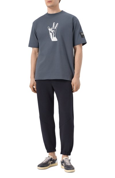 Футболку из хлопкового джерси украсили брендированными контрастными принтами. Модель с круглой горловиной в рубчик гармонично впишется в повседневный гардероб.