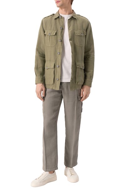 Брюки со стрелками сшиты из легкого льна. Модель с широким эластичным поясом дополнена открытыми боковыми карманами, задними на пуговицах и двумя карго. Наши стилисты предлагают создать образ с футболкой, кардиганом и сандалиями.