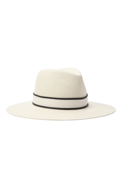 Шляпу с широкими полями сплели вручную из натуральной соломки. Фигурную тулью украсили лентой с контрастным кантом и отделкой из цепочки мониль.