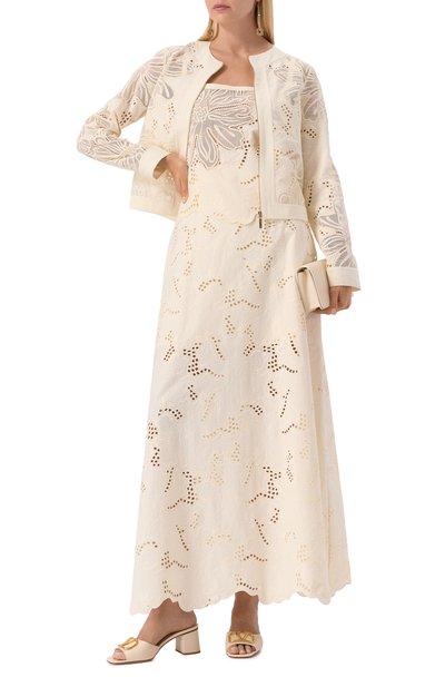 Раскроенную по косой макси-юбку с эластичным поясом сшили из вискозного твила Fluid с добавлением льна. Модель украсили высокими боковыми разрезами.