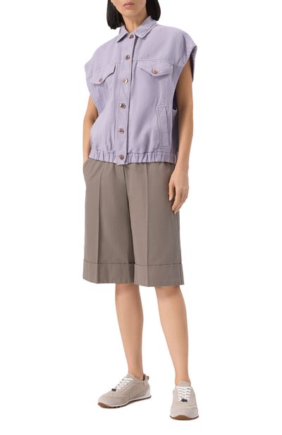 Жилет с четырьмя внешними и двумя внутренними карманами впишется в непринужденные повседневные образы. Для пошива модели с эластичным поясом использовали твил Cover из хлопка и льна. Сзади под воротником – фирменные цепочки мониль.