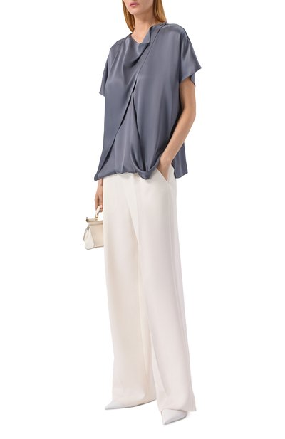 Рубашку с широкими укороченными рукавами украсили крупным клетчатым узором из пайеток. Для пошива модели с закругленным нижним краем использовали меланжевый лен. Наши стилисты предлагают составить монохромный образ с брюками из такой же ткани.