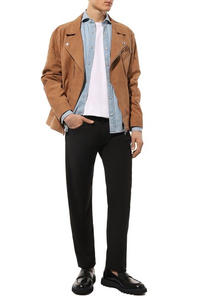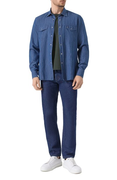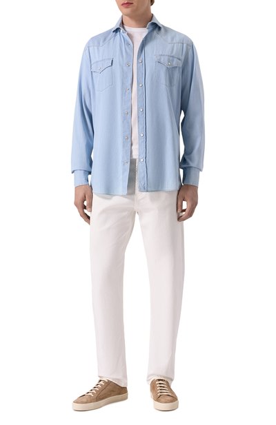 Рубашку с фигурной кокеткой и двумя нагрудными карманами сшили из легкого хлопкового денима. Модель кроя Easy fit застегивается кнопками, манжеты – пуговицами.