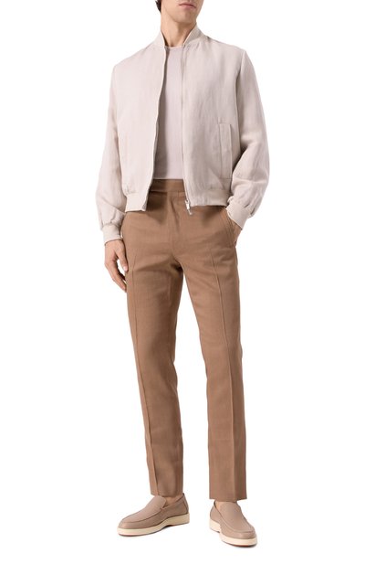 Лоферы из замши украшены шевронным узором на союзке. О принадлежности марке напоминает золотистая эмблема Solomeo на заднике. Пару с внутренней отделкой из кожи поставили на плоскую резиновую подошву.