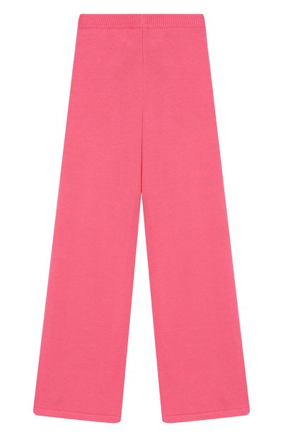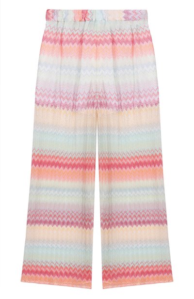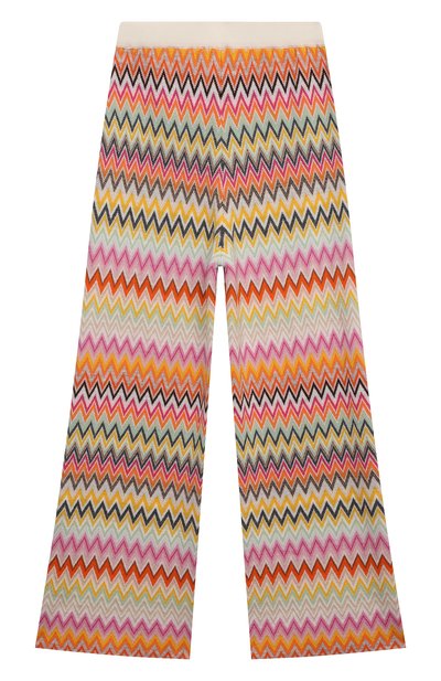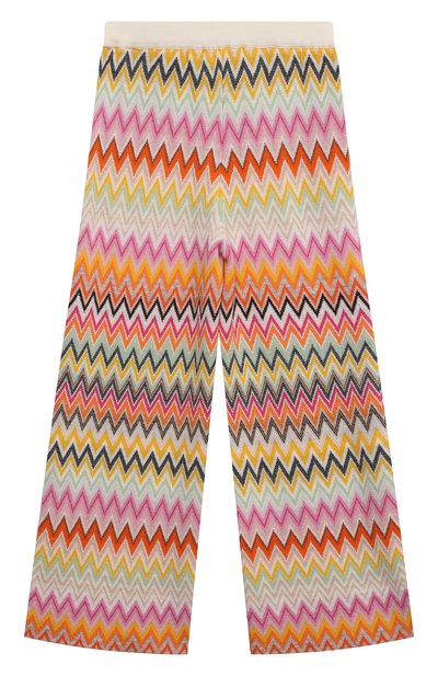 Брюки с эластичным поясом и коротким подкладом сшили из тонкой хлопковой ткани с фирменным разноцветным узором зигзаг. Модель с запахами на брючинах украсили круглой брендированной пластиной сбоку.