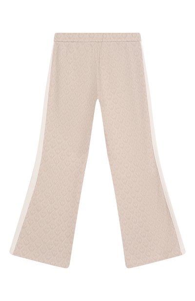 Брюки с эластичным поясом и коротким подкладом сшили из тонкой хлопковой ткани с фирменным разноцветным узоро м зигзаг. Модель с запахами на брючинах украсили круглой брендированной пластиной сбоку.